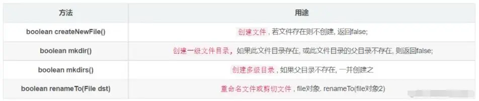 使用上面講到的File類構造器去實例化一個File類, 僅僅是在內存中創建了這個對象, 只有當File類對象調用下面的方法才是真正的在磁盤上創建一個文件或文件目錄;