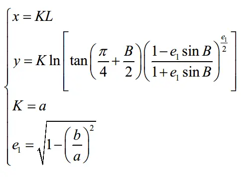 接下來我們説一下互聯網地圖真正使用的投影——Web墨卡託或者也叫球形墨卡託。一般來説按照傳統地圖學的要求,一個投影座標系都要有一個對應的橢球體,比如從WGS84的座標轉換成國內騰訊地圖或者百度地圖的座標,都是要經過一步橢球體轉換成gcj02橢球下的經緯度然後才能打點。所以有沒有小夥伴在開發中使用Geolocation接口獲取的經緯度直接傳入上面地圖api中打點發現誤差很大?就是因為沒有轉成gcj02橢球下的經緯度。但是web墨卡託這個投影其實並不符合地圖學的要求,它沒有對應的橢球體,它是谷歌自己造出來的(因為簡單),也可以説對任何橢球體都適用,但這種時候我們在表達一個位置信息時嚴格來説應當這樣表達:橢球下的Web墨卡託投影座標是。
