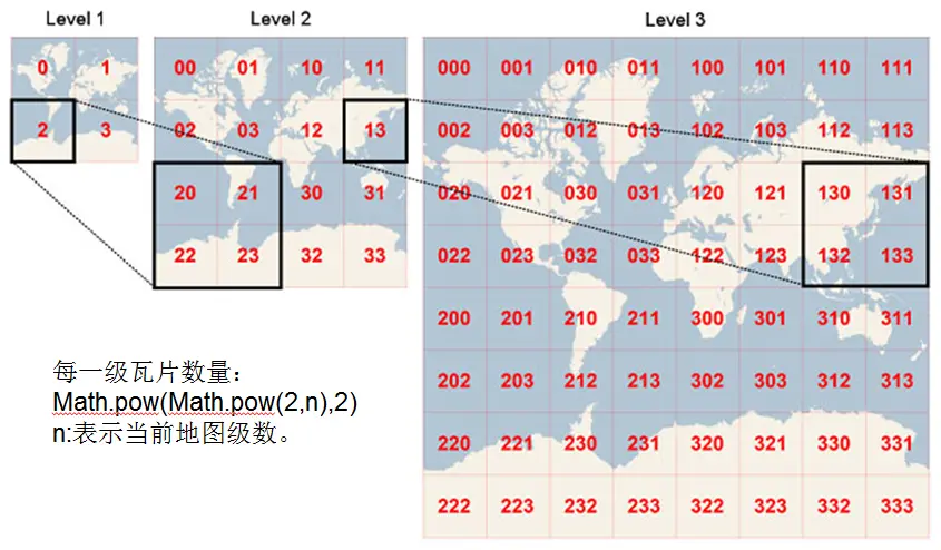 瓦片地圖金字塔模型是一種多分辨率層次模型,從瓦片金字塔的底層到頂層,分辨率越來越低,但表示的地理範圍不變(這張圖瓦片座標是從左上角開始,通常谷歌系標準的瓦片是從左下角起始的)。
