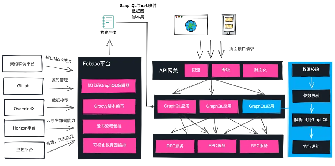 在 Febase 平台,我們提供了低代碼的 GraphQL 編輯器,Groovy 腳本的編寫能力,發佈流程的管控,可視化的數據圖編排能力,最終基於這些能力,平台能夠輸出一份 GraphQL 應用配置,這份配置的內容包括: