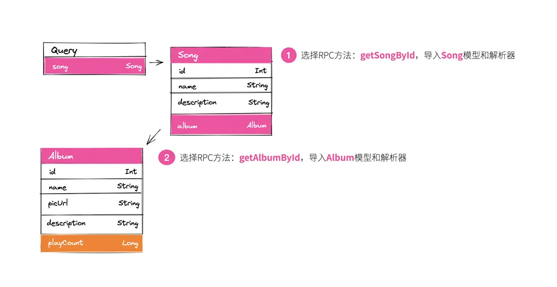 - 解析器:我們需要描述這些類型節點所需要執行的查詢,當然,並不是所有的節點都需要執行查詢,我們只需要保證查詢的結果和節點的類型定義一致即可。比如在上圖的節點中,我們分別給 song 節點和 album 節點執行了一次查詢,他們會調獲取歌曲詳情以及獲取專輯詳情的 RPC 接口返回相應的數據。