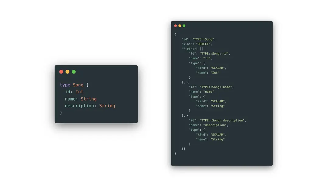 通過研究 GraphQL 的引擎源碼,我們發現,GraphQL 的模型定義,其實可以通過官方引擎提供的內置方法,等價轉換稱一份標準的 JSON 結構。那麼,相對於生成模型定義的源碼,生成這份 JSON 結構要簡單得多,比如,上文提到的 Song 模型,就可以進行如下轉換: