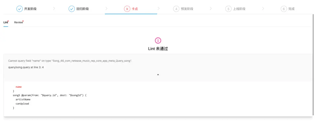 目前在雲音樂,所有前端側的應用研發都遵循這樣一套流程,這套流程極大保證了我們研發過程中的安全性和規範性。針對 GraphQL,我們在應用卡點環節提供了語法校驗,基於 graphql-language-service-interface 提供的 getDiagnostics,可以幫助我們快速定位到錯誤的位置。