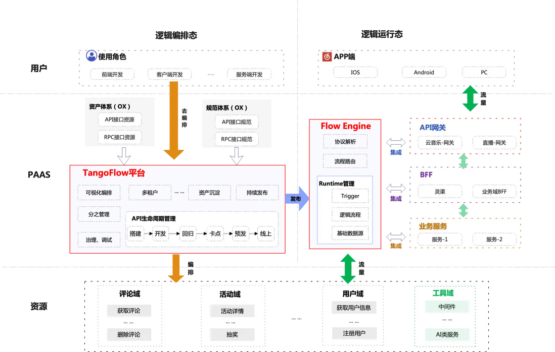 在實際業務需求背景下,TangoFlow 尋求構建組裝式架構,整合雲音樂服務端技術棧,提供基礎邏輯編排功能,以某種方式(網關API、統一SDK等)暴露編排結果;從長遠來看,作為研發全鏈路低代碼化中的一環,構建符合雲音樂現狀及長遠願景的服務端低代碼平台;今天我們一起來聊下TangoFlow 的產生背景以及平台化建設實踐;
