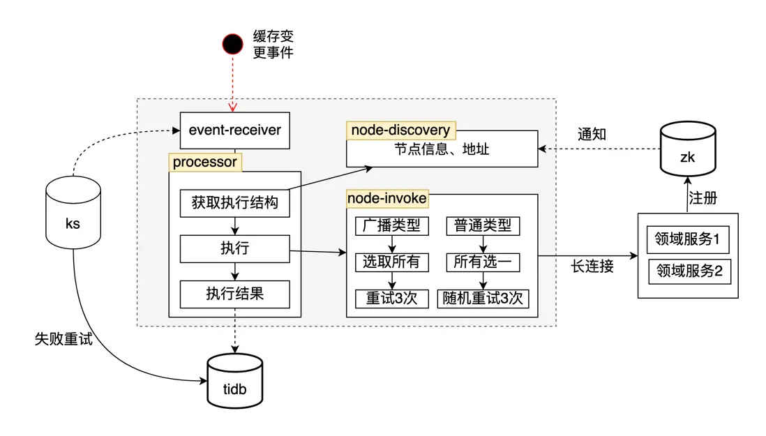 ②事件執行模塊:當緩存管道接收到緩存清理事件後,會根據接收事件的編碼,獲取到由開發人員編排的緩存清理節點鏈路,根據鏈路結構通過長鏈接同步執行節點清理