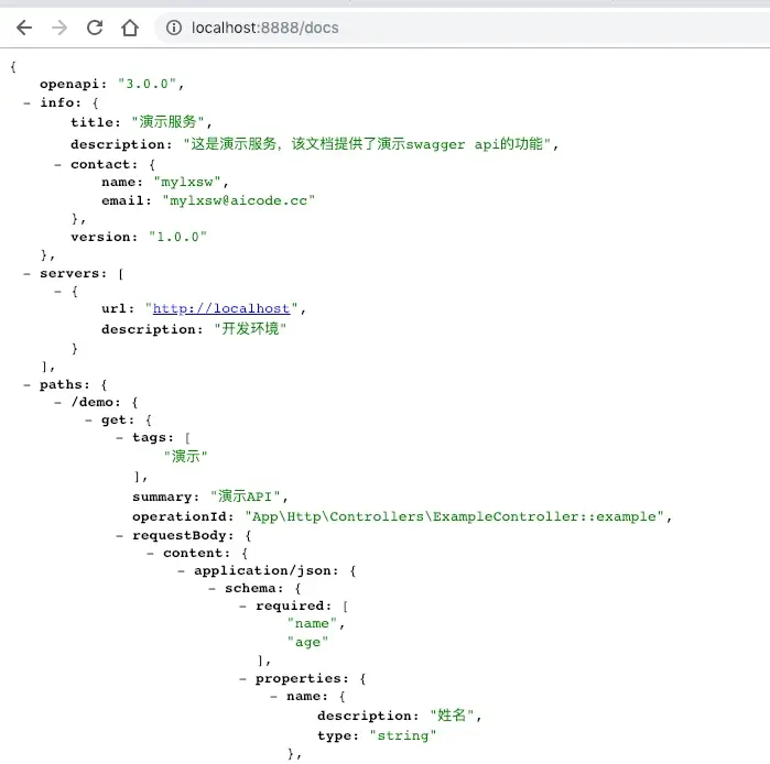 執行下面的命令,就可以生成文檔了,生成的文檔在storage/api-docs/api-docs.json。