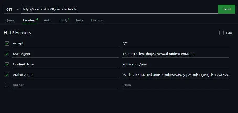 向http://localhost:3000/decodeDetails發送一個GET請求,並帶有一個帶有令牌值的Authorization頭(您在測試登錄路由時得到了它)。