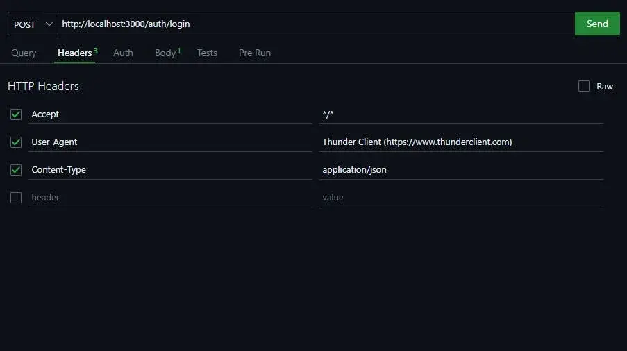 向http://localhost:3000/auth/login發送一個POST請求,其中包含Header Content-Type : application/json和JSON主體以及用户名和密碼,這是您在註冊路由中創建的。