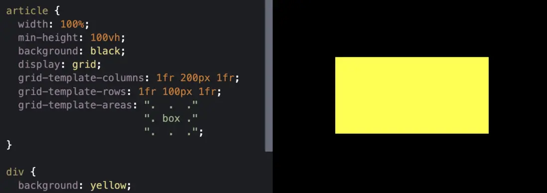 在下面所有的例子中,我們將使用display: grid屬性。這將<article>元素建立為網格容器,併為該容器生成塊級網格。我們已經將網格容器設置為寬(width: 100%)和高(min-height: 100vw),這樣我們的div就有足夠的空間在其中移動。