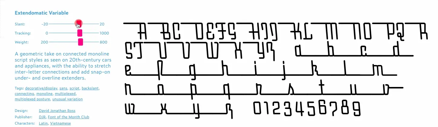 以下的幾個效果圖都來源於v-fonts.com,諸如此類的效果還有很多,總共可變字體有三百多個,大家有興趣的可以去找找看。