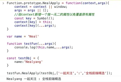 testFun.NealApply(testObj,['一起關注',':','全棧前端精選']);
