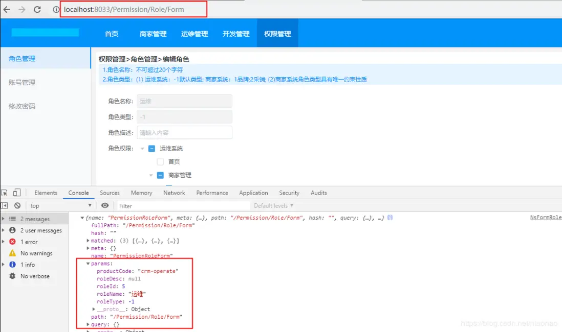 在頁面 NsTableRole 點擊編輯,觸發編輯角色方法 onEditRole() 攜帶參數訪問 name 屬性映射的路由,NsFormRole 頁面生命週期函數 created 獲取路由攜帶的參數。傳參效果如圖
