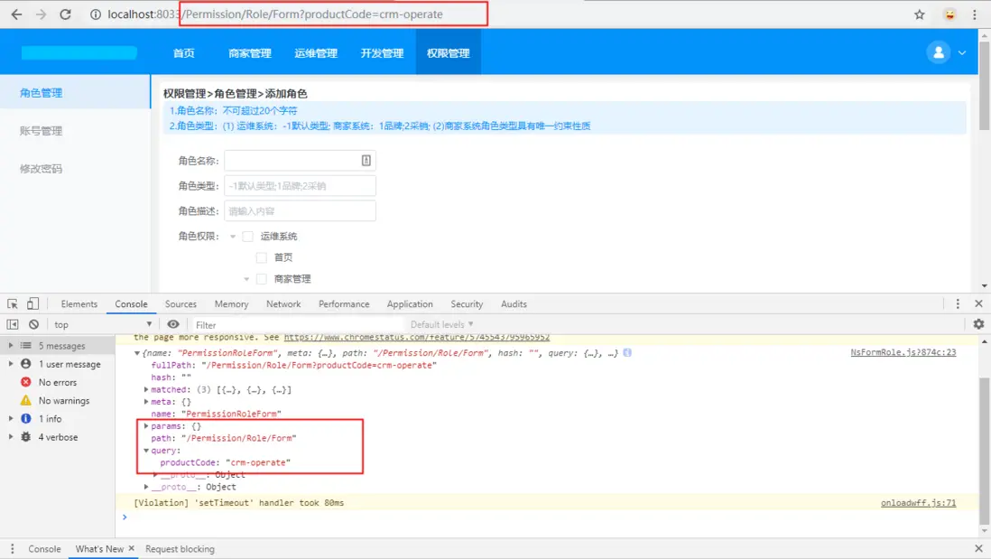 在頁面 NsTableRole 點擊添加角色,觸發添加角色方法 onAddRole() 攜帶參數訪問 path 屬性映射的路由,NsFormRole 頁面生命週期函數 created 獲取路由攜帶的參數。傳參效果如圖