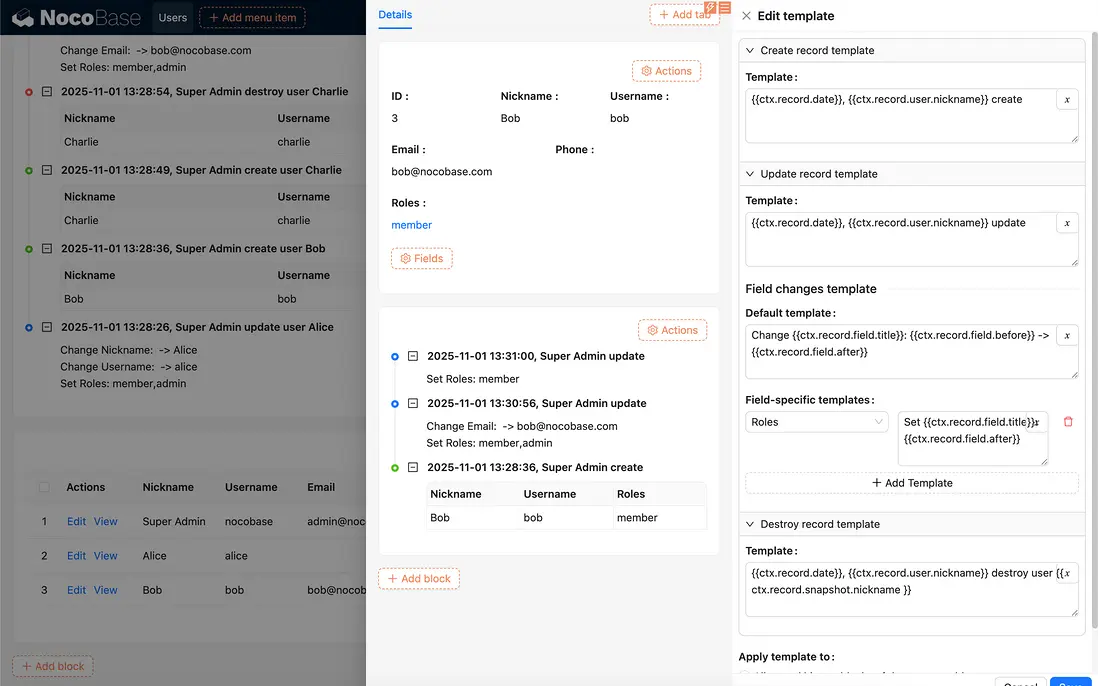 歷史記錄插件用於追蹤數據的變更過程,自動保存新增、修改、刪除操作的快照與差異記錄,幫助用户快速回溯數據變化、審計操作行為。