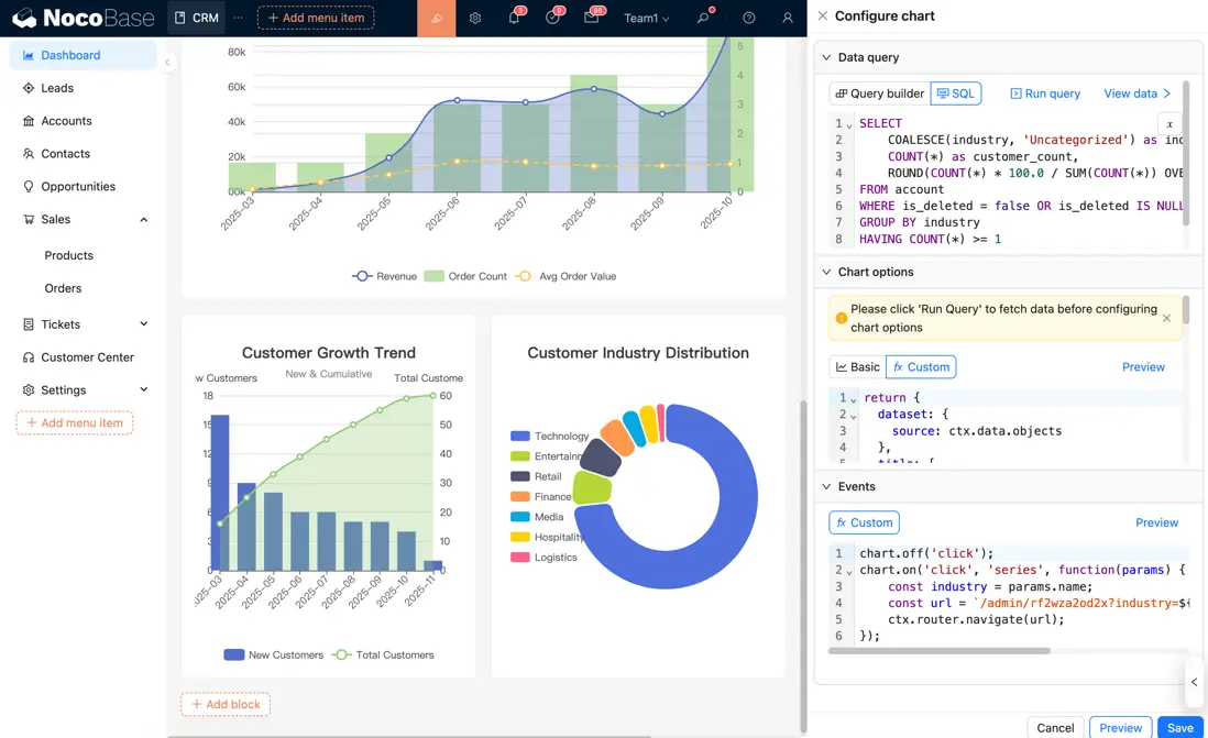 NocoBase 2.0 中基於 Echarts 提供了全新的數據可視化插件,支持可視化配置模式和 SQL、JSON 模式,支持事件,可以方便地滿足複雜圖表、多圖表聯動、數據下鑽等場景。
