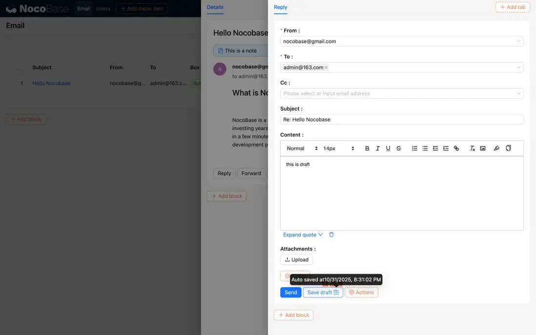 郵件管理插件使用 FlowEngine 進行了重構,使 AI 員工可以無縫參與到郵件的總結、分析、撰寫中,同時新增了自動保存草稿等功能。