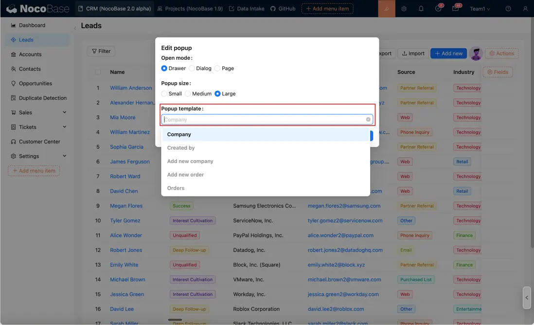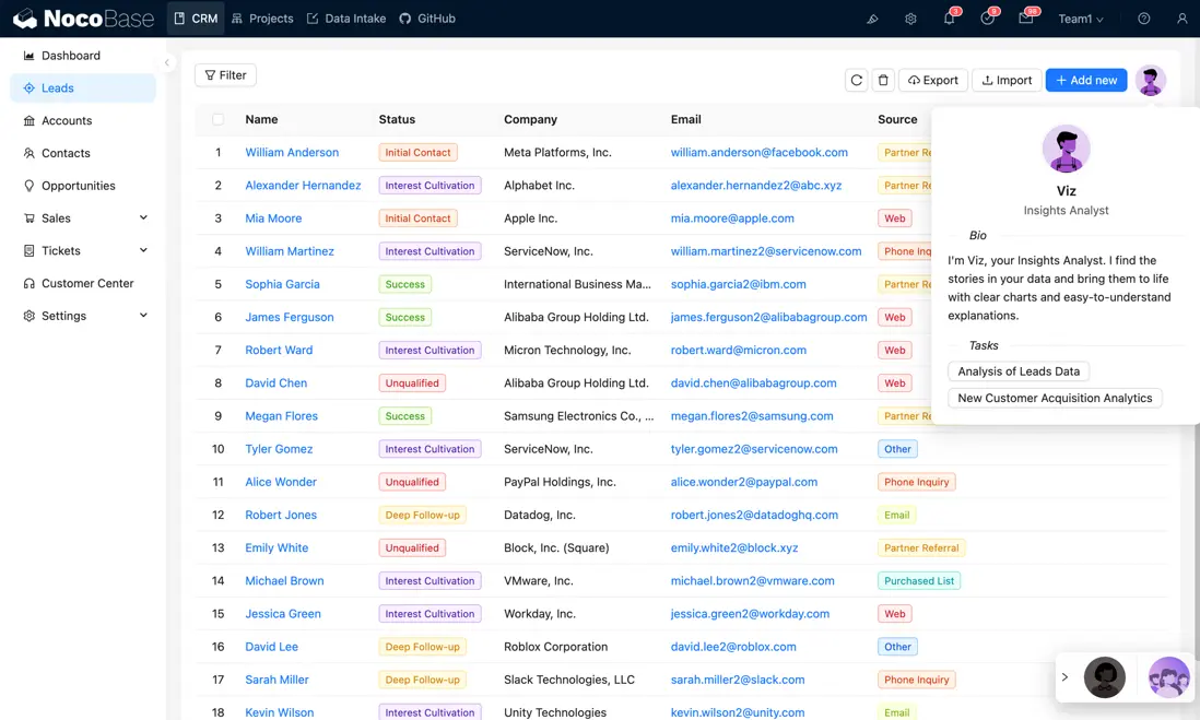 NocoBase CRM 是一個無代碼、靈活且強大的客户關係管理基座,涵蓋: