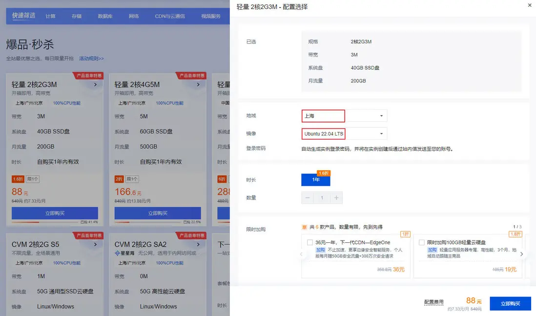 在活動中購買雲服務器時,配置是固定的,但價格很有吸引力。用户只需要簡單地選擇服務器地域和鏡像系統即可完成購買。