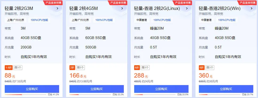 在活動頁面,例如輕量應用服務器的優惠機型中,有各種配置的選擇,比如2核2G3M帶寬88元一年、2核4G5M帶寬166.6元/年等。