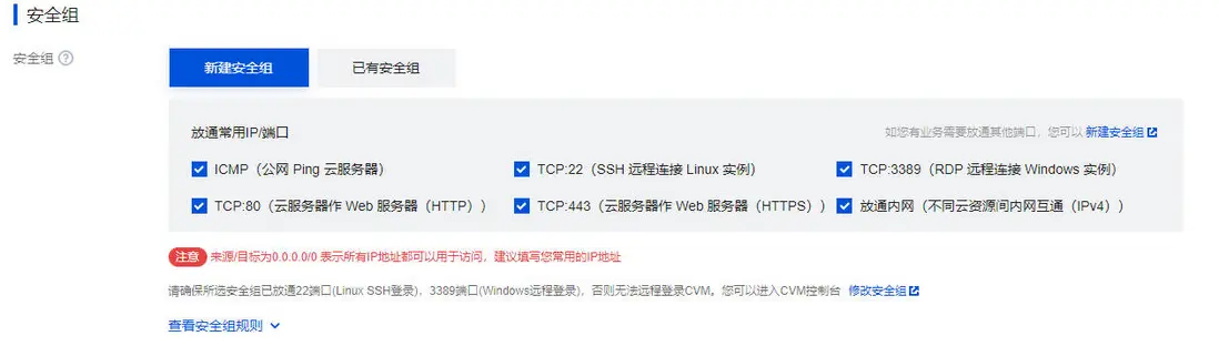我們這裏搭建網站,所以放通常用IP/端口勾選了全部端口和協議。後續雲服務器創建後,也可以設置或修改安全組規則。