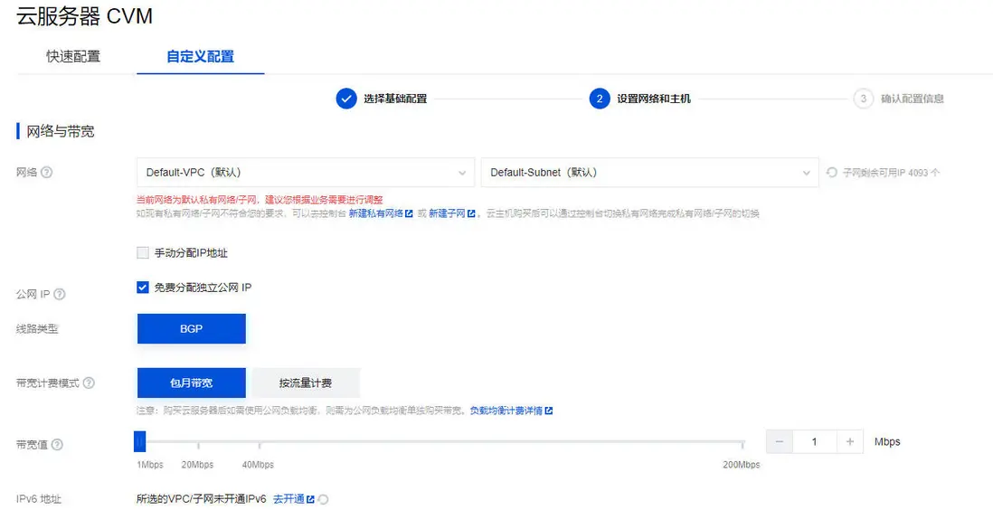 默認網絡配置基本滿足需求,公網IP一般需要勾選上,1Mbps帶寬對於建站足夠。