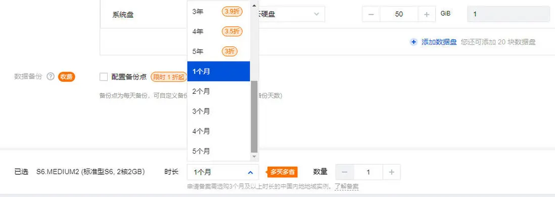 由於購買雲服務器用於網站搭建,需要長期使用雲服務器,所以選擇了包年包月計費模式。值得注意的是,官方活動通常提供包年包月計費模式。