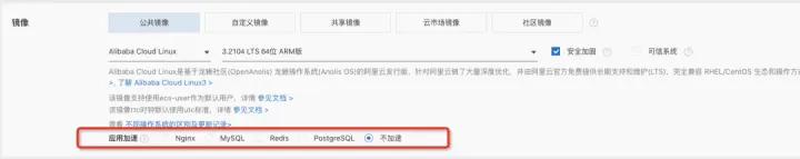 2023年1月12日 阿里雲 ECS 的售賣頁有了一些新的變化,在用户選擇倚天+ Alinux3 新建實例時,多了一個新的選項“應用加速”。這個功能是 阿里雲 ECS 基於 KeenTune 提供典型雲場景的開機即用的全棧調優解決方案,業務平均性能提升達到 20%+,為客户提供遠高於 x86 實例的性價比。