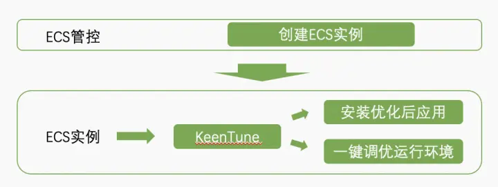 在售賣頁選擇“應用加速”,KeenTune 會從阿里雲 ECS 管控側接收到需要進行調優的應用,在新購買的倚天實例上安裝已經經過編譯優化的應用版本,並且使用“一鍵專家調優”功能,提供包括 CPU、內存、IO、網絡及安全及應用本身的優化,從而實現開機即用的全棧調優。