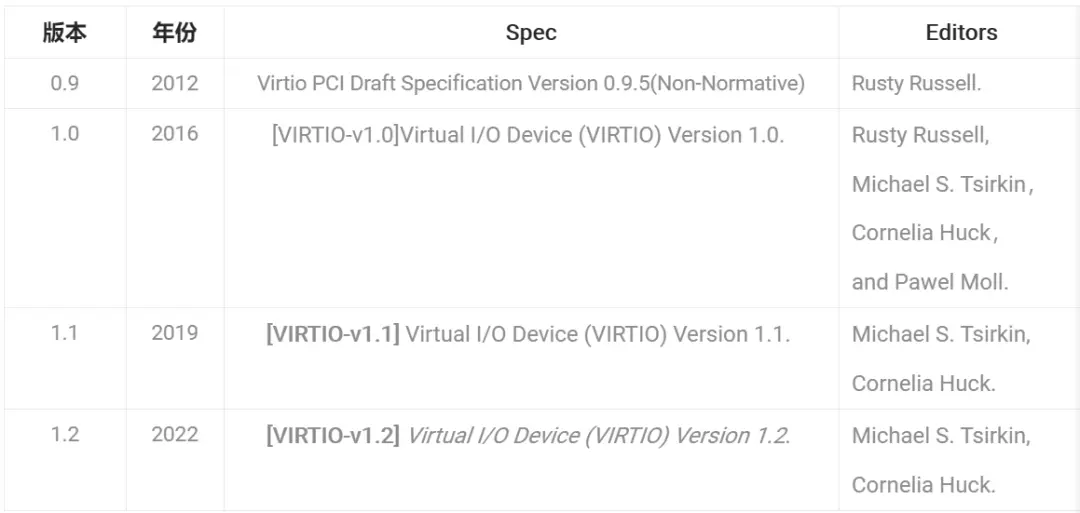 2012 最早由 Rusty Russell 起草的並不是一個正式的規範。後續 virtio spec 由 virtio 技術委員會負責,併發布了多個版本。在委員會的主持下,社區的廣泛參與下,不斷地為 virtio spec 增加新的特性與能力,目前 virtio spec 已經推進到 v1.2 版本。