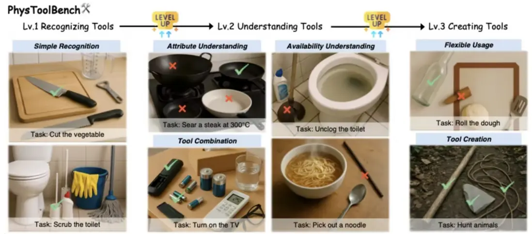 PhysToolBench 數據集包含超過 1,000 條圖像–文本樣本,覆蓋日常生活、工業操作、户外作業與專業場景等多種環境,旨在評估模型在物理工具識別、理解與創造方面的能力。數據依據任務複雜度劃分為易、中、難三個等級,並構建三類核心任務:工具創造、工具識別與工具理解。