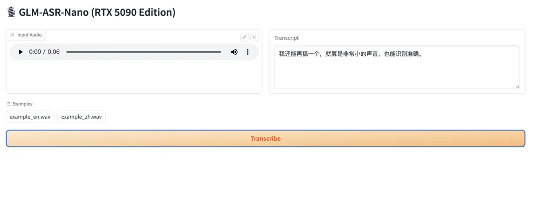 GLM-ASR-Nano 通過高效的聲學建模與優化訓練策略,實現小模型規模下的高精度語音識別。系統在支持普通話與英語的同時,對多種中文方言及低語、微聲等複雜聲學場景表現出較強魯棒性,在噪聲環境下仍能穩定轉寫,適用於端側部署、會議記錄與隱私友好型語音識別應用。
