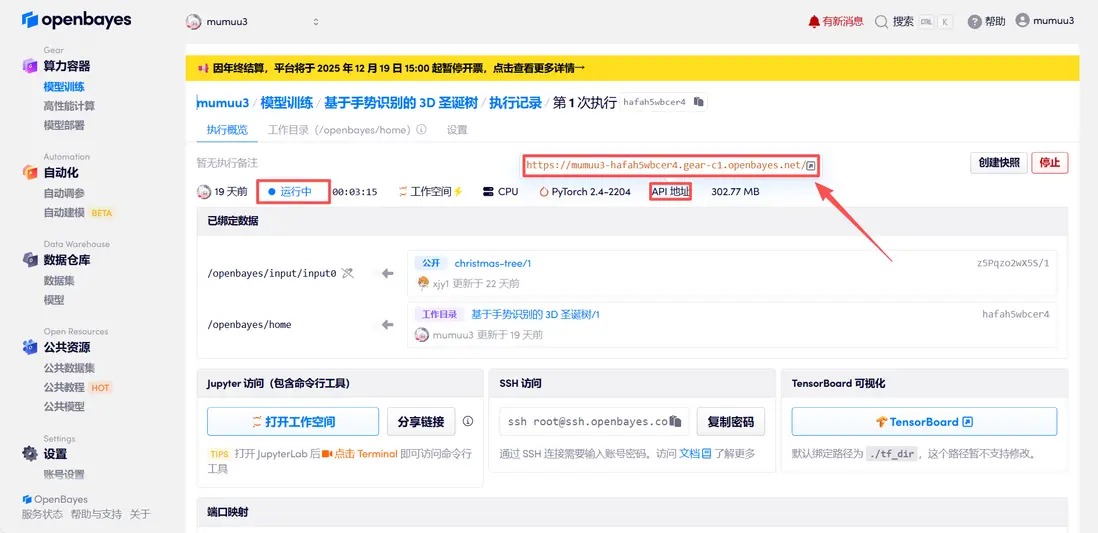 4.等待分配資源,首次克隆需等待 3 分鐘左右的時間。當狀態變為「運行中」後,點擊「API 地址」旁邊的跳轉箭頭,即可跳轉至 Demo 頁面。請注意,用户需在實名認證後才能使用 API 地址訪問功能。