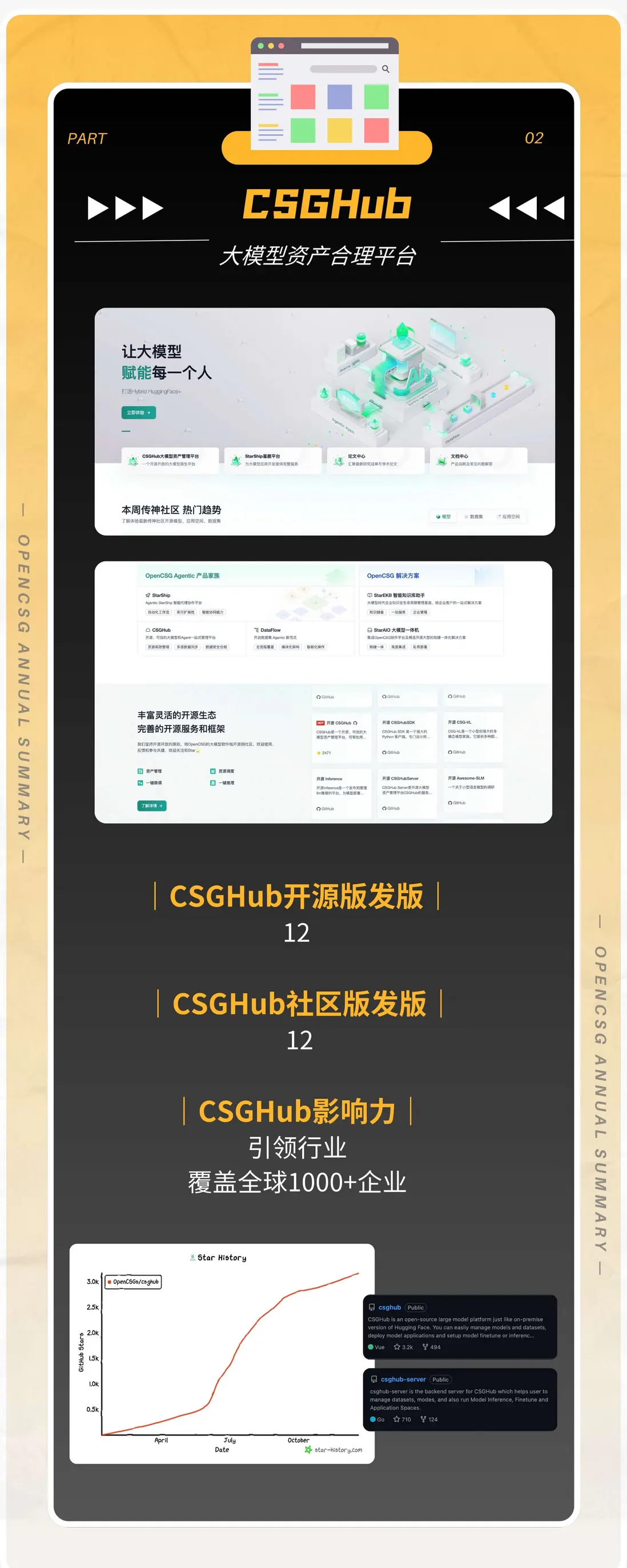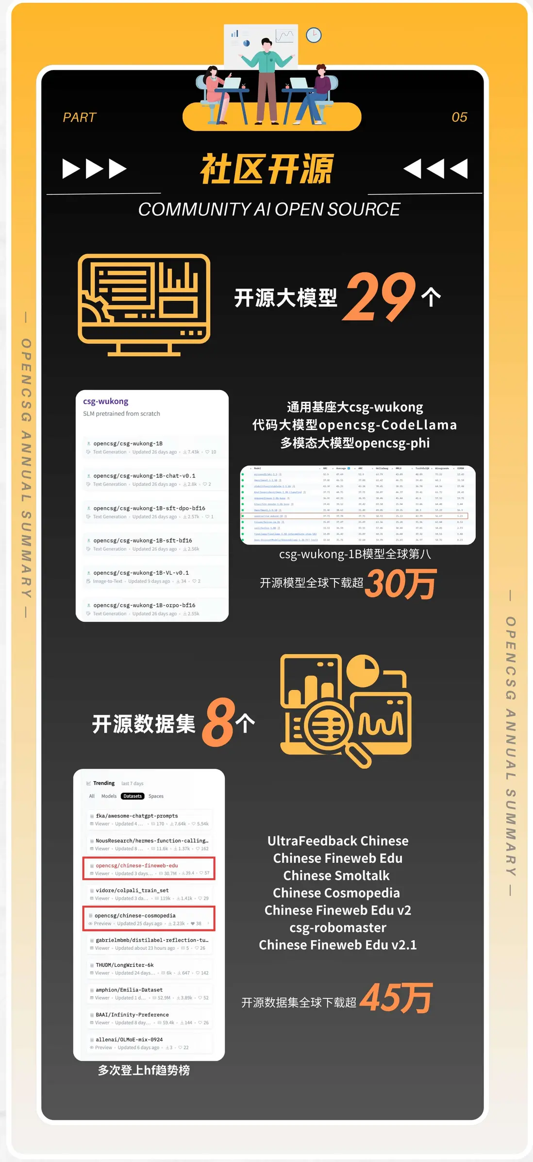 回首這一年,OpenCSG社區實現了穩步發展:數據集持續迭代更新,高質量模型不斷涌現,開源工具日益完善,每一步都凝聚着大家的智慧與汗水。在此,OpenCSG將彙總並回顧過去一年中的進展與成果,以慰謝與迴應這一路上所獲得的鼓勵、建議、指正、啓發與認可!