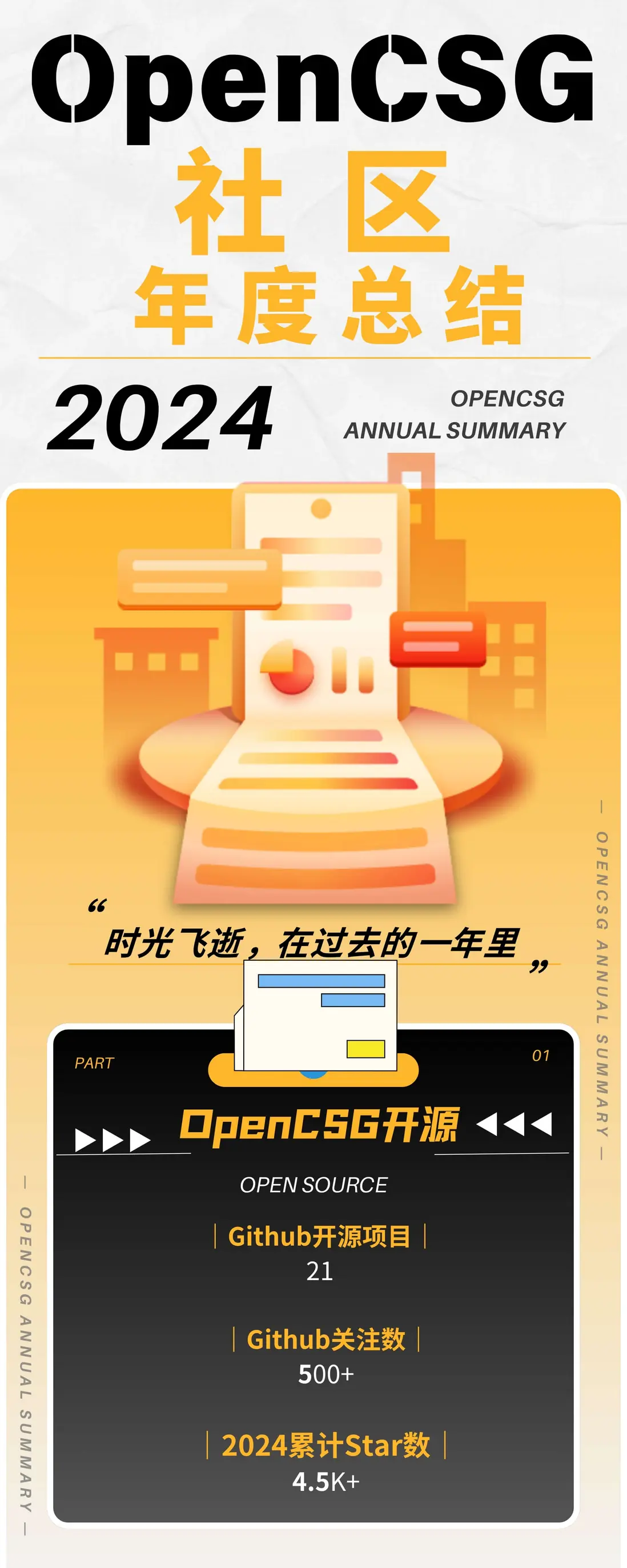 2024年是OpencsG 社區高速成長的一年。從技術創新到用户生態,從開源產品發佈到社區活動,社區影響力日益擴大,技術成果不斷涌現,開源生態持續繁榮。這些成績離不開社區每一位夥伴的支持與貢獻,感謝每一位社區夥伴的信任與陪伴!