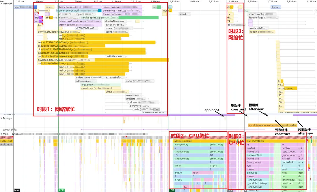 例如,針對VPC列表頁的主渲染流程,我們在 NG App啓動、根組件constructor及ngAfterViewInit、列表頁組件constructor及ngAfterViewInit,分別加上performance.mark,則能在Timings面板中看到下圖情況: