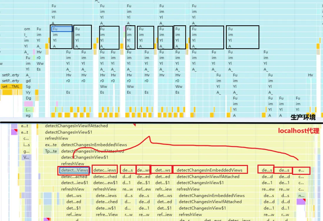 可以看出有一段結構很相似的調用,出現了多次重複。從localhost環境抓取的性能圖中就可以明顯看出,這段重複執行的是 detectChangesInEmbeddedViews 函數,它是angular的內部函數。在嵌入式視圖場景中,如果有大量ngFor、ngIf就會觸發。通過源碼分析,這一段正是導航組件中的代碼實現造成的。