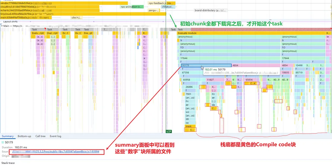 標題中所謂的webpack代碼展開,其實就是執行這些數字命名的包裹函數,而V8引擎的惰性編譯策略,可能不會在流式下載文件的環節就直接編譯這些代碼,所以棧底全都是compile code的色塊。另外,webpack的啓動機制會保證所有chunk下載完成後,才啓動代碼展開工作,從 時段1 => 時段2 的銜接點可以看到,雖然主chunk文件main.xxxx.js早已下載完成,但代碼沒有立即展開,而是等待最後一個chunk下載完成之後,才進行展開。