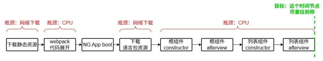 通過上一節中對性能圖透徹分析之後,我們已經能將性能圖跟源碼對應起來,並且能將性能圖跟加載流程對應起來,同時對一些關鍵節點心中有數。接下來要做的就是找問題、找可優化的空間,以達到我們的目標。例如針對VPC列表頁的分析可知,主渲染流程在性能圖中大致是: