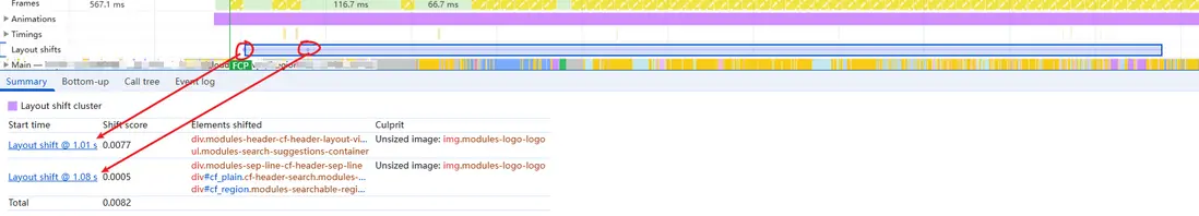 記錄佈局偏移情況。佈局偏移是指頁面上一個可見元素的位置發生了移動,就會被記錄在這裏。每次偏移都對應截圖中的一個小點。