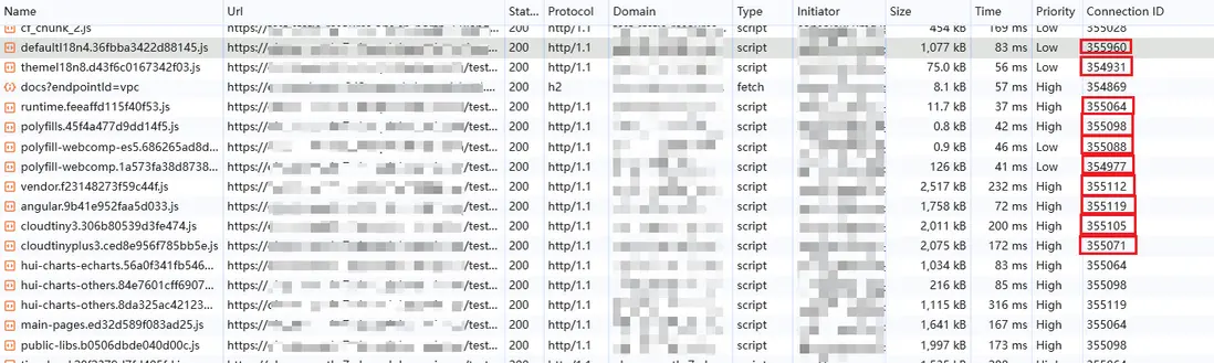 但真實情況中,有見過10個TCP連接的,如下圖所示:(在DevTools的網絡面板中,將connection ID列放出來,每個connection ID對應一個TCP連接)