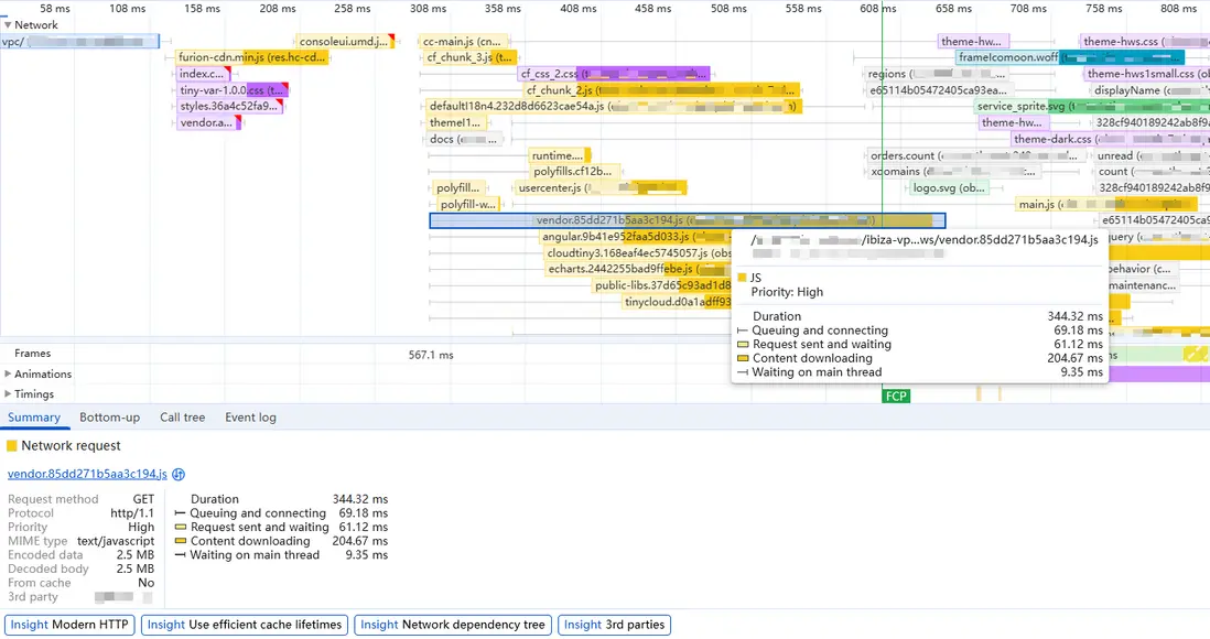 一個靜態資源加載過程的各個階段中,網絡傳輸階段體現在Network面板,內容解析編譯階段體現在worker線程,資源的處理階段體現在主線程。聯合分析三個面板就能掌握詳細的靜態資源加載全流程。