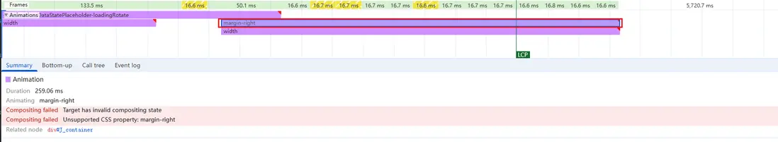 體現合成器線程的情況,它主要反應了我們使用的css animations或transition的執行情況。 每個色塊對應着一次正在運行的animations或transition,並且點擊這個色塊,能在摘要面板(summary)中看到着一次執行的相關信息(特別是被執行的DOM節點會體現出來)