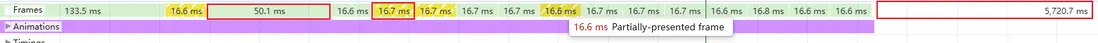 3. 紅色塊:表示幀沒有完成渲染,被瀏覽器丟棄。