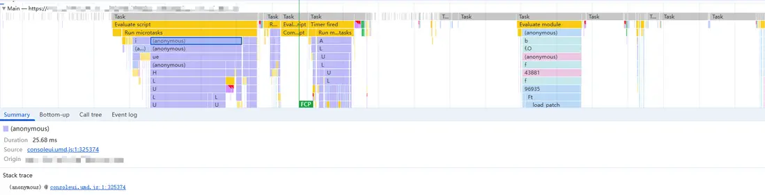 面板中task下面的Evaluate script和Evaluate module(聲明瞭type="module"的script)色塊就是在執行代碼。一般在Evaludate色塊下面的(anonymouse)色塊表示的是頂層代碼,可以理解為一個超大的匿名函數,將所有待執行代碼包裹其中。