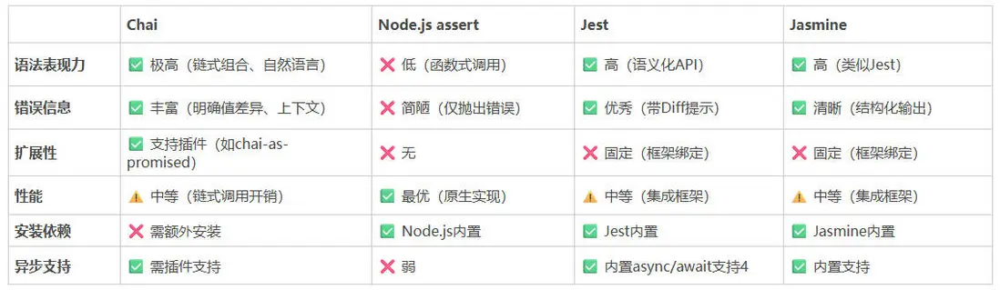 不同斷言庫使用的語言風格不同,但也有一些能同時支持兩種風格。常見的幾種斷言庫的特點對比如下: