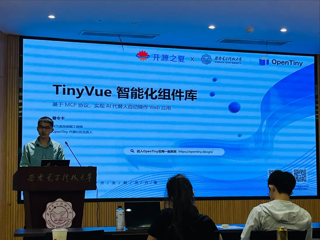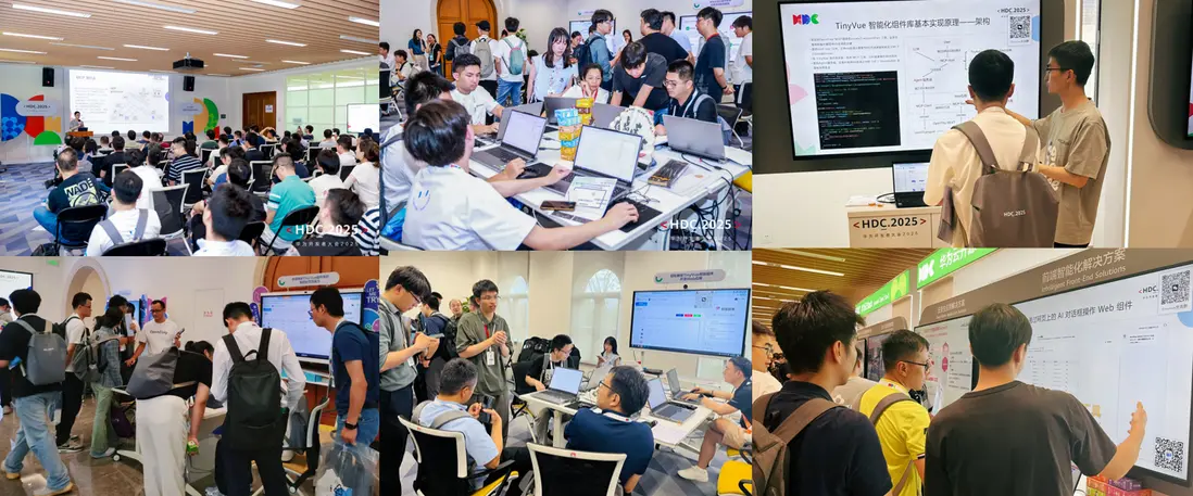 其中HDC 2025作為年度重點活動,OpenTiny圍繞前端智能化解決方案設置四大核心環節:專題論壇中,華為雲高級前端開發工程師曾令卡發表《基於MCP協議:快速解鎖AI操作Web組件》主題分享,深度解析TinyVue智能組件庫的實踐邏輯;展覽展示區通過互動演示吸引300+名開發者、研究人員及企業代表交流;產品體驗官活動讓開發者親身感受AI對話框與Web組件的語音/文字交互能力;兩場CodeLabs訓練營分別聚焦TinyVue智能組件開發與TinyEngine AI搭建能力,助力開發者快速上手實操。
