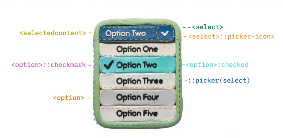 option 和 selectedcontent 的子項,都可以用普通的 css 選擇器去分別控制樣式。