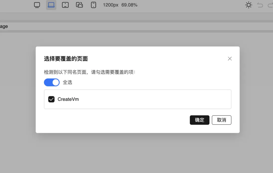 .vue文件。 - 若存在同名頁面,按提示“覆蓋/跳過/全部覆蓋”進行處理。