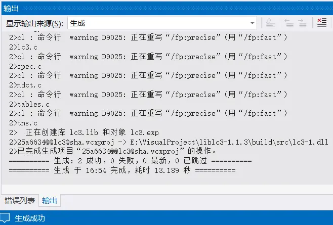 打開liblc3工程後,依次選擇頂部菜單:生成→生成→生成lc3-1,Visual Studio就開始編譯lc3模塊。編譯過程可在Visual Studio界面下方觀察,直到編譯完成如下圖所示。