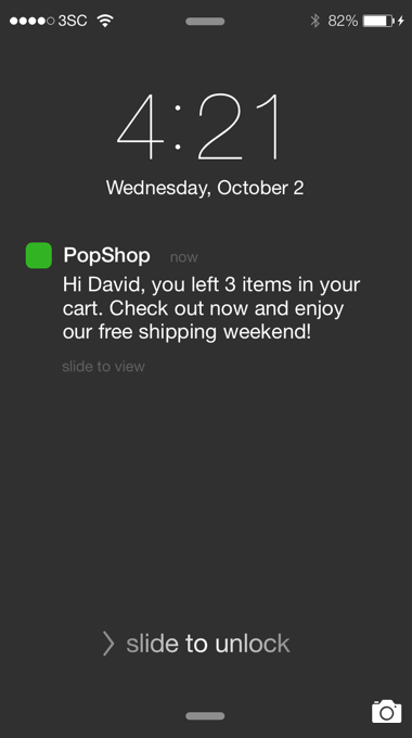 It is not uncommon for a user to add items to their shopping cart but then suddenly not continue with the purchasing process. You want the user to complete the action as soon as possible, though. Push notifications are the ideal solution in this type of scenario, because they can be highly personalized and can contain a deep link that takes the user to exactly where they left off. Push notifications without personalization can drive users insane, whereas one small personalized message — triggered at the right mobile moment — can push (pun intended) users in the right direction.